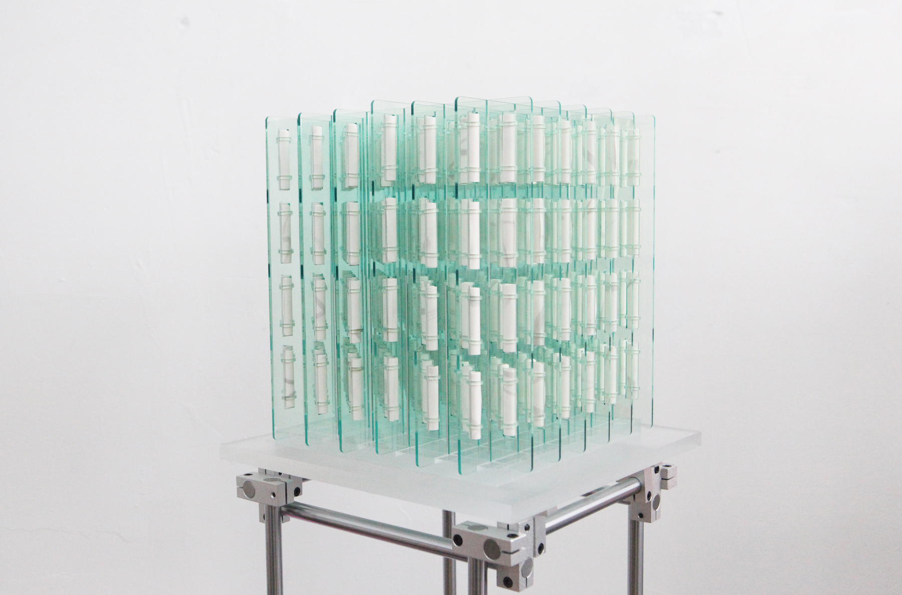 For Gu, light is an implicit yet essential artistic medium. Under shifting conditions, the interaction of overlapping segments becomes more distinct and three-dimensional, enriching the spatial experience. Gu favors exhibition spaces lit like dim theaters, where spotlights illuminate only the works, allowing them to appear as luminous stars in the darkness.