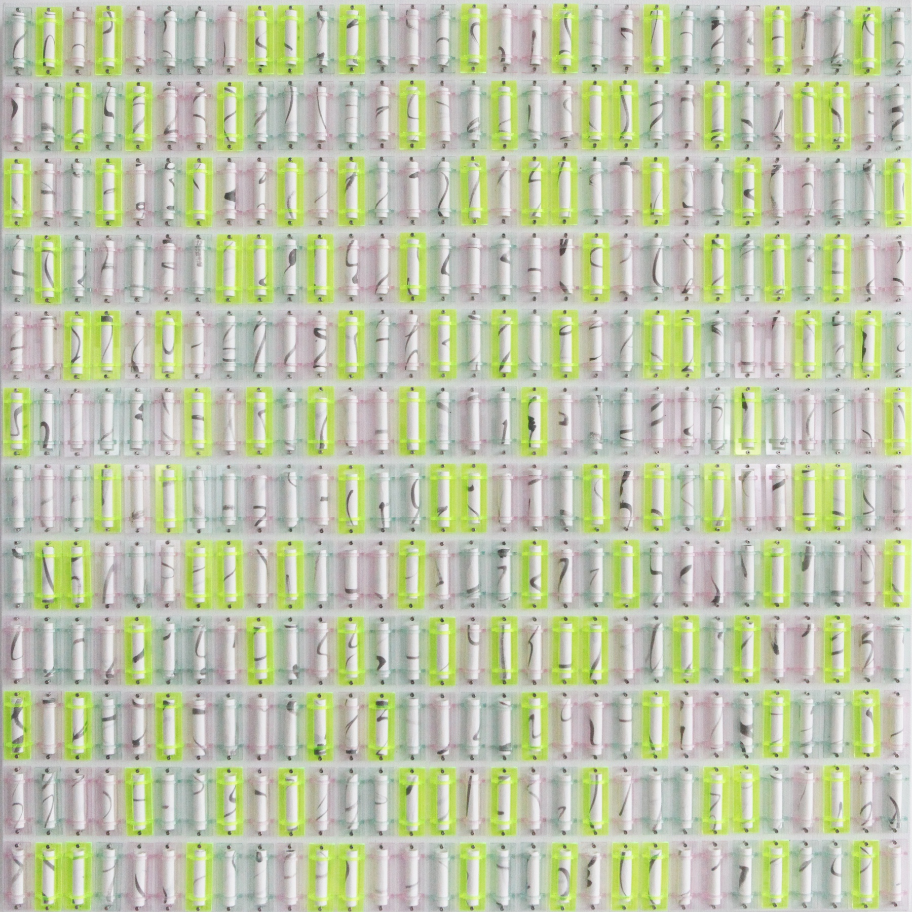 Gu Benchi arrives at order through a unique origin. While accompanying his wife in 2012 to a textile market in Shanghai, he encountered a stall where thousands of polyester thread spools were arranged by specification, material, and color on shelves nearly three meters high and more than ten meters long. This spectacle awakened something fundamental: the recognition that the universe itself is organized according to a subtle, invisible order, and that it’s the artist’s task to make this order tangible.