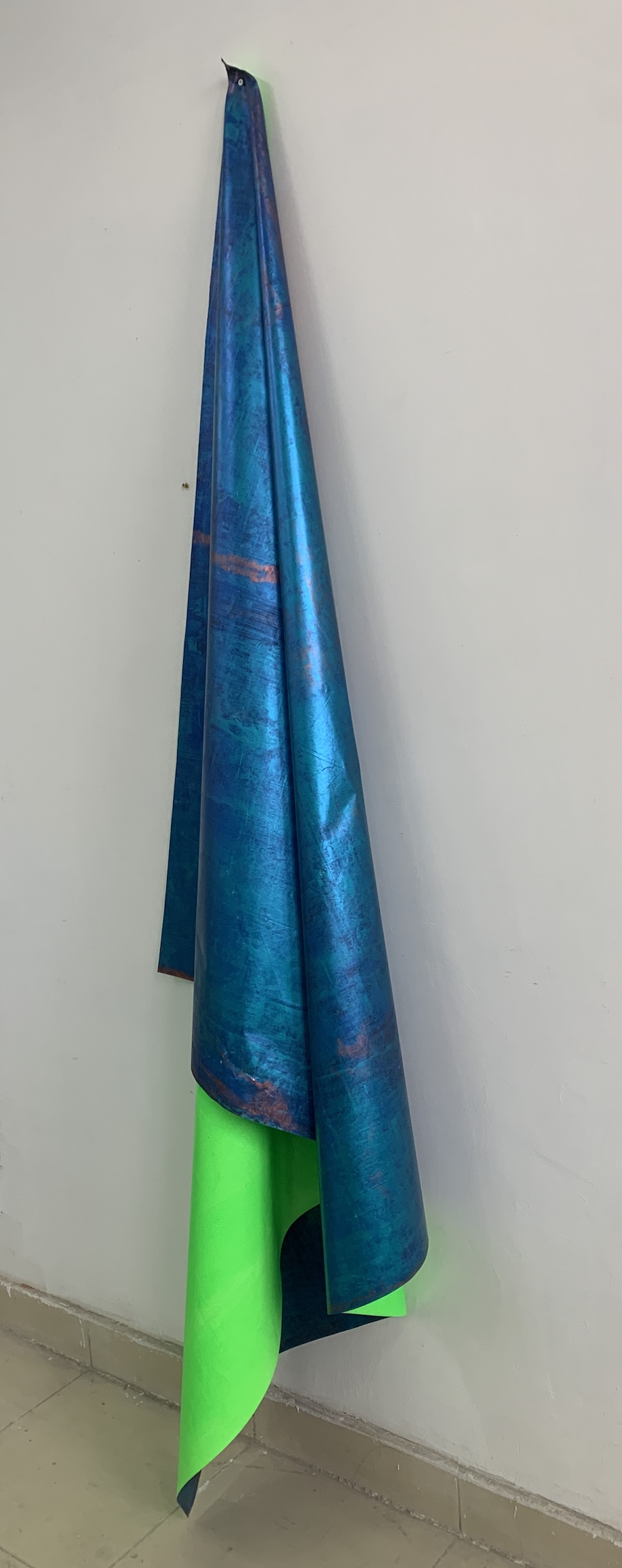 His works’ conceptual resonance are multi-layered and rich. Fluorescent pigments, which in earlier works served as metaphors for the virtual hues of electronic screens, have migrated outward into the skin of the city: corrugated metal facades, vacant billboards, and the metallic barriers of unfinished buildings that fill the modern metropolis.