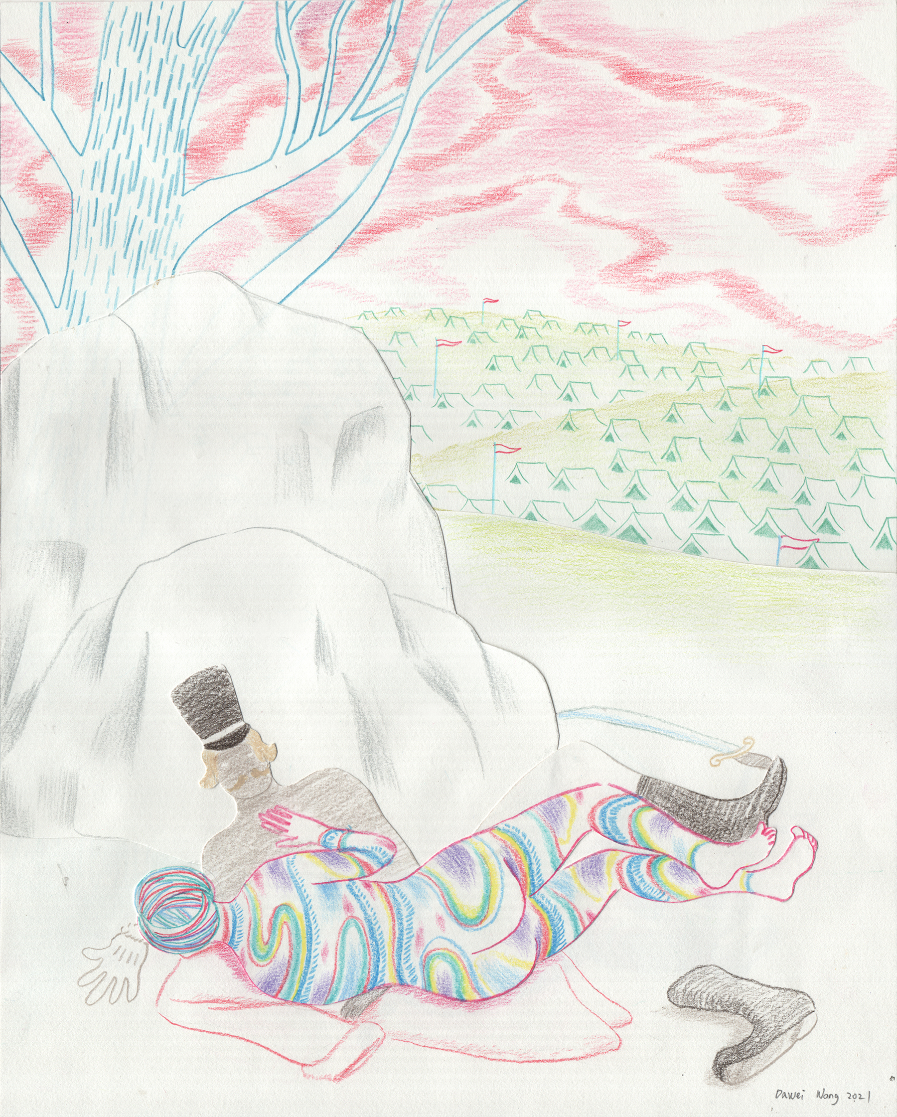 Wang's practice is rooted in field observation and photographic capture: spontaneous gestures in streets, parks, squares, trains, and urban transitional spaces. But the camera functions less as documentary evidence than as a trigger for material and affective recomposition. In his previous works, recurring figures, guards, workers, people sitting distractedly, often appear at measured distance, held at the periphery of the frame or isolated in intermediate spaces. This distance is not indifference, but a deliberate ethical and narrative strategy: it refuses the reductive certainty of psychological explanation in favor of an open, speculative psychology. The viewer is invited to inhabit what Wang calls "the void," an operative silence within the composition that opens the work to projective interpretation rather than narrative closure.