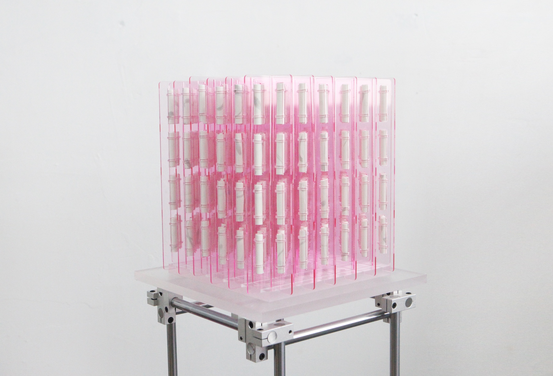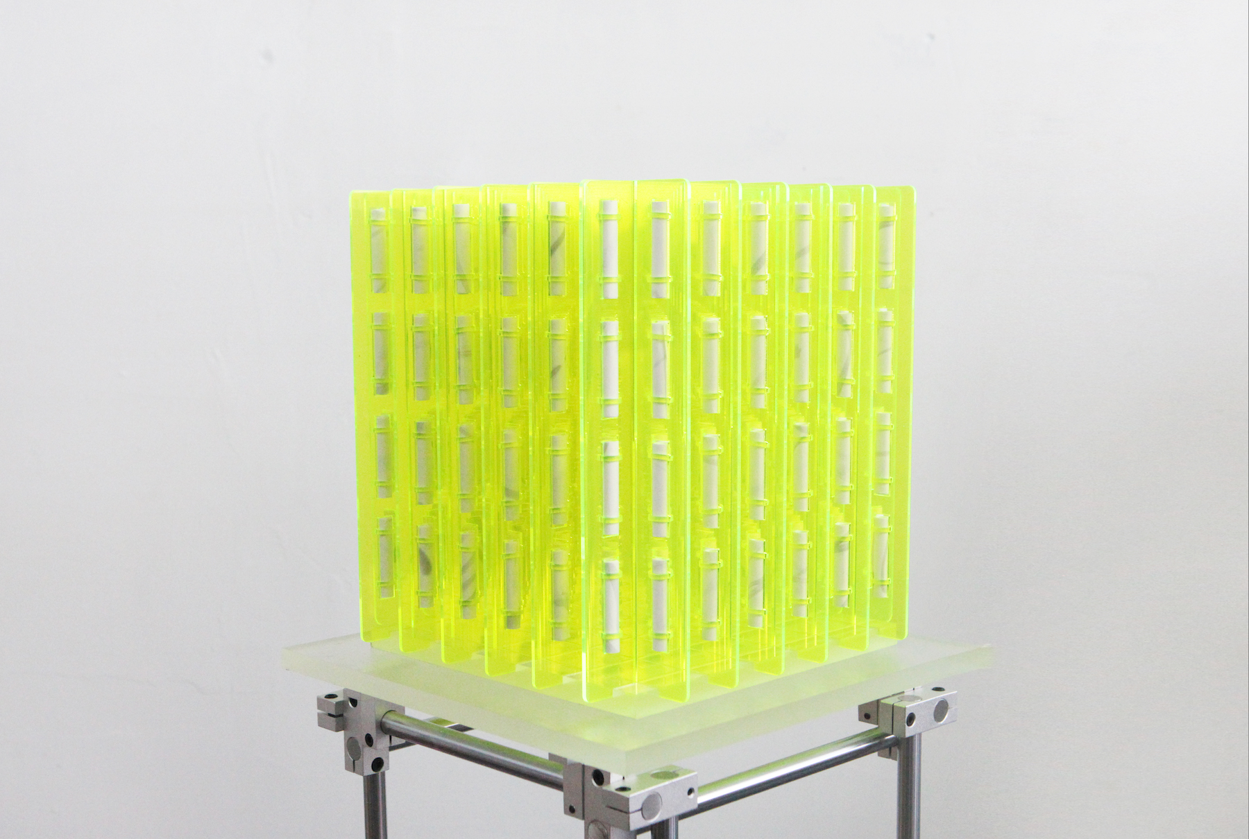 For Gu, light is an implicit yet essential artistic medium. Under shifting conditions, the interaction of overlapping segments becomes more distinct and three-dimensional, enriching the spatial experience. Gu favors exhibition spaces lit like dim theaters, where spotlights illuminate only the works, allowing them to appear as luminous stars in the darkness.