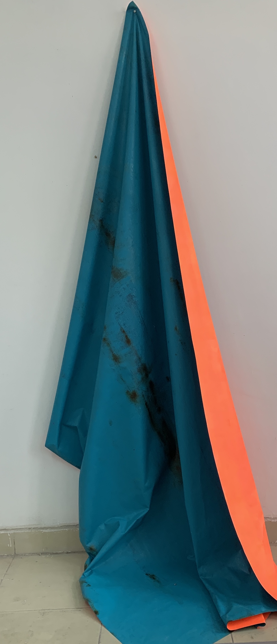 His works’ conceptual resonance are multi-layered and rich. Fluorescent pigments, which in earlier works served as metaphors for the virtual hues of electronic screens, have migrated outward into the skin of the city: corrugated metal facades, vacant billboards, and the metallic barriers of unfinished buildings that fill the modern metropolis.
