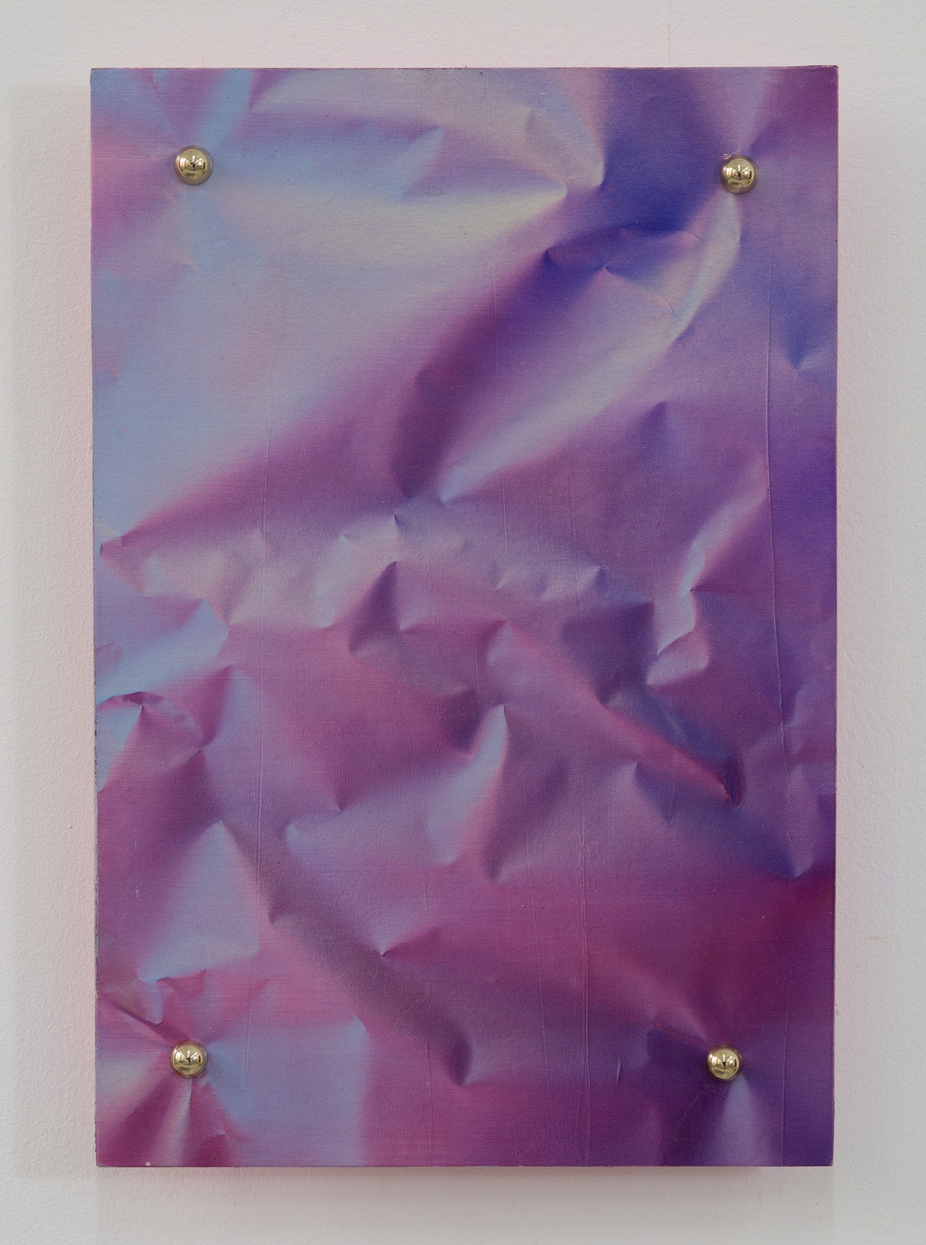 The conceptual architecture of 中间态 (The Intermediate State) rests on a technical innovation that Fu describes as "reverse engineering," a process that fundamentally inverts the traditional relationship between painting and its referent. Fu does not simply translate volume through the classical means of chiaroscuro and perspective: he constructs a real spatial presence in order to then collapse it into the two-dimensional plane, without losing its original radiance. The methodology unfolds in three distinct stages: first, paper is physically crumpled, folded, and compressed to construct an actual volumetric form; next, an airbrushed pigment, often incorporating metallic particles that respond dynamically to ambient light, is applied from a single, predetermined viewpoint, allowing the paint to function not as a descriptive medium but as a recording apparatus; finally, the paper substrate is carefully unfolded and flattened, returning the three-dimensional object to the pictorial plane while preserving what Fu evocatively terms the "light-shadow memory" of its brief existence in space. This approach situates the work in a hybrid zone, between the indexicality of the photographic medium and pictorial fabrication, between automatic capture and human intervention. The images produced are less paintings than archives: they precisely document the encounter of light and matter in a unique spatiotemporal instant.