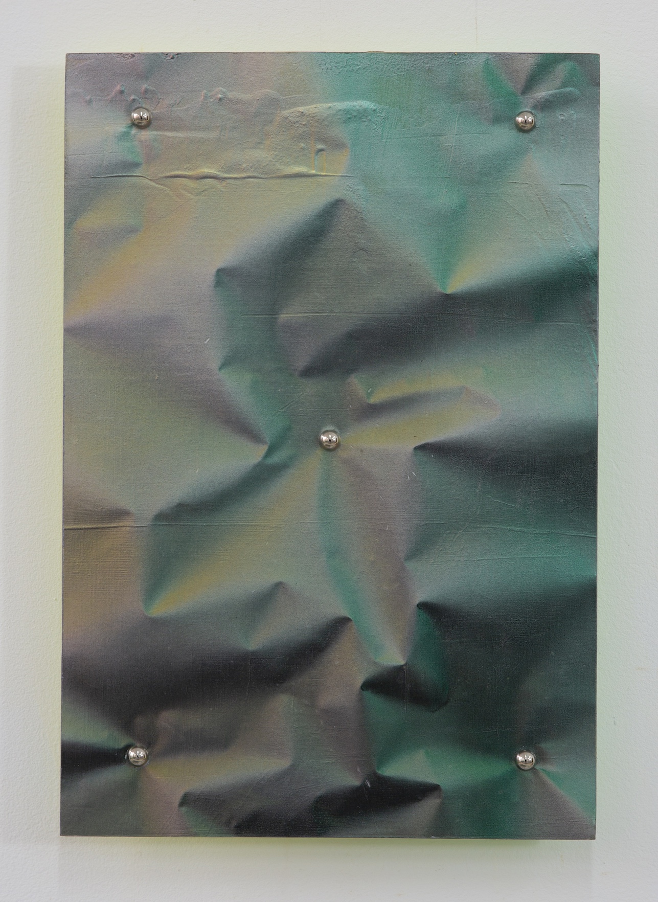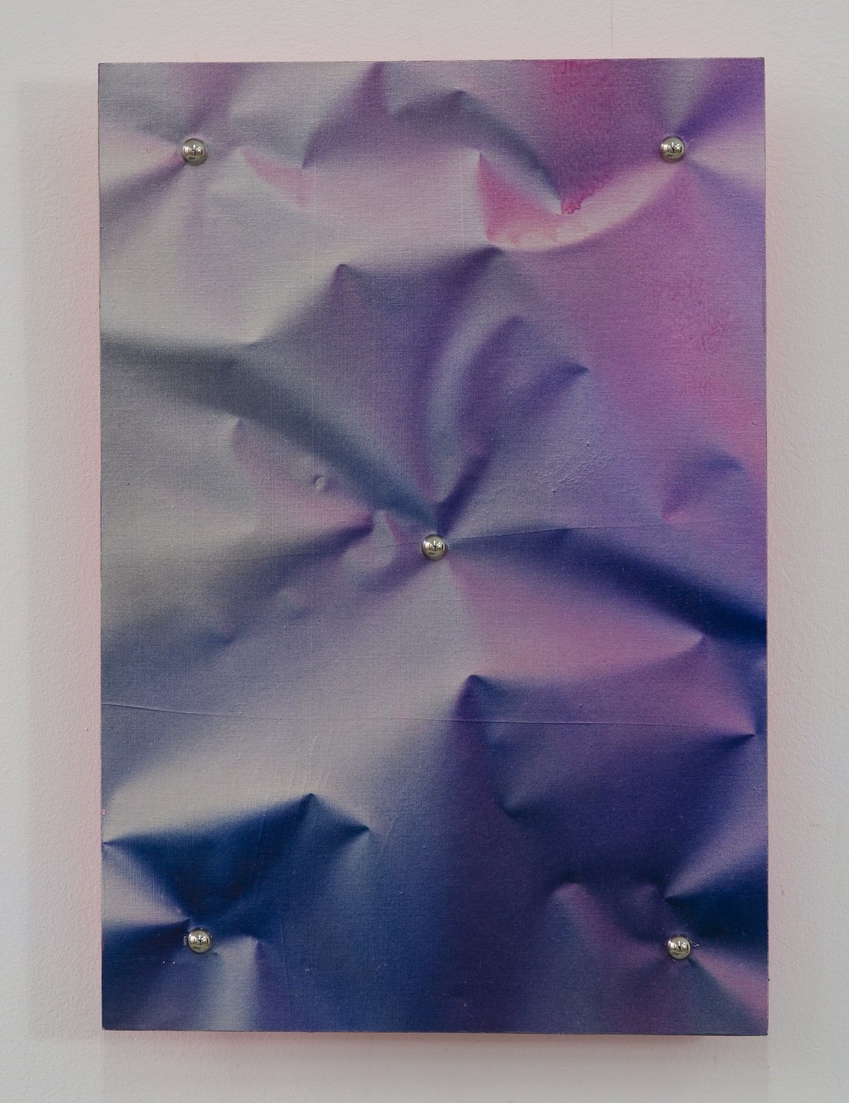 The compositional logic of the Fold-Fix series embodies this dialectical condition through a tension between predetermined industrial order and organic unpredictability. Each work is governed by a pre-established pattern of rivets, rational anchor points that represent systemic discipline, the macro-level structures of industrial production and bureaucratic control. Yet between these fixed coordinates, the supple paper generates folds whose precise configurations remain fundamentally uncontrollable. Even when the rivet pattern is identical across multiple works, each folding produces a unique light-shadow effect. This methodology, Fu suggests, functions as a formal analogy of contemporary social structure. The works function simultaneously as art objects and as symbolic representations of power. They show the relationship between systemic constraints and individual freedom, traced on crumpled paper and marked by light.
